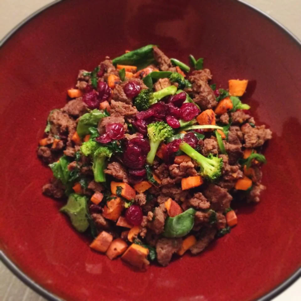 In a sauce pan cook 1 lb ground meat and sweet potatoes separately. Add Worcestershire sauce and Himalayan sea salt to ground meat. When its half done add broccoli, let it cook then add diced 1/2 cup of red onions, 1/2 cup of mushrooms and pepper. When it's completely done add hand full of diced spinach. Cook 1 diced sweet potato when half done add Himalayan sea, Italian seasoning and 1-2 tables spoons Worcestershire Sauce. Mix it all together in a big ass bowl and add dried cranberries! If it's dry then throw in another tablespoon of virgin coconut oil. Prep & cook time is no longer then 17 mins. Feeds about 3-5 ppl.